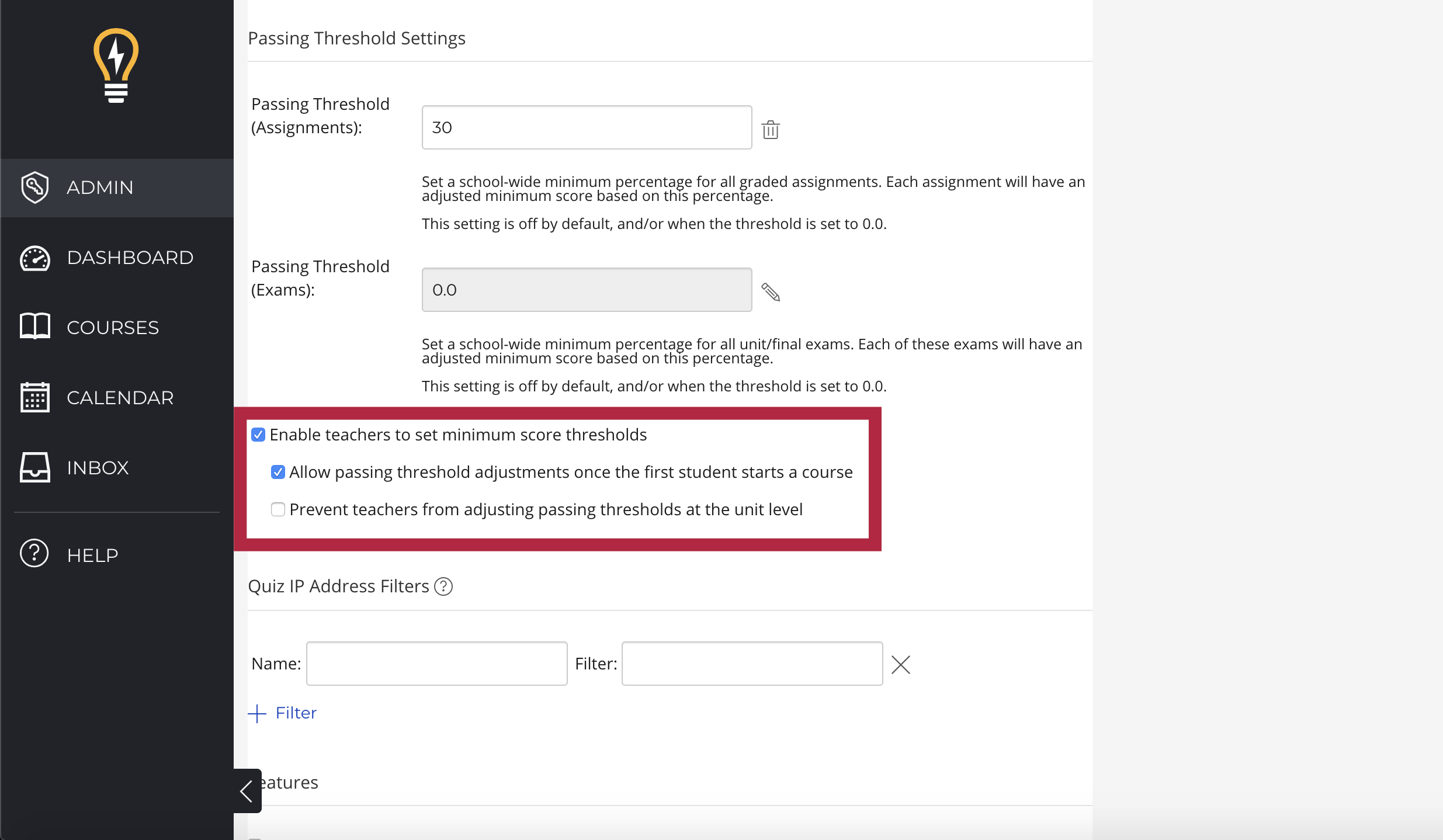 Passing Threshold allows schools to set a minimum percentage that must be reached on assignments and/or exams. Editing the Passing Threshold settings in the LMS will set a school-wide Passing Threshold for all assignments and/or exams in all courses.