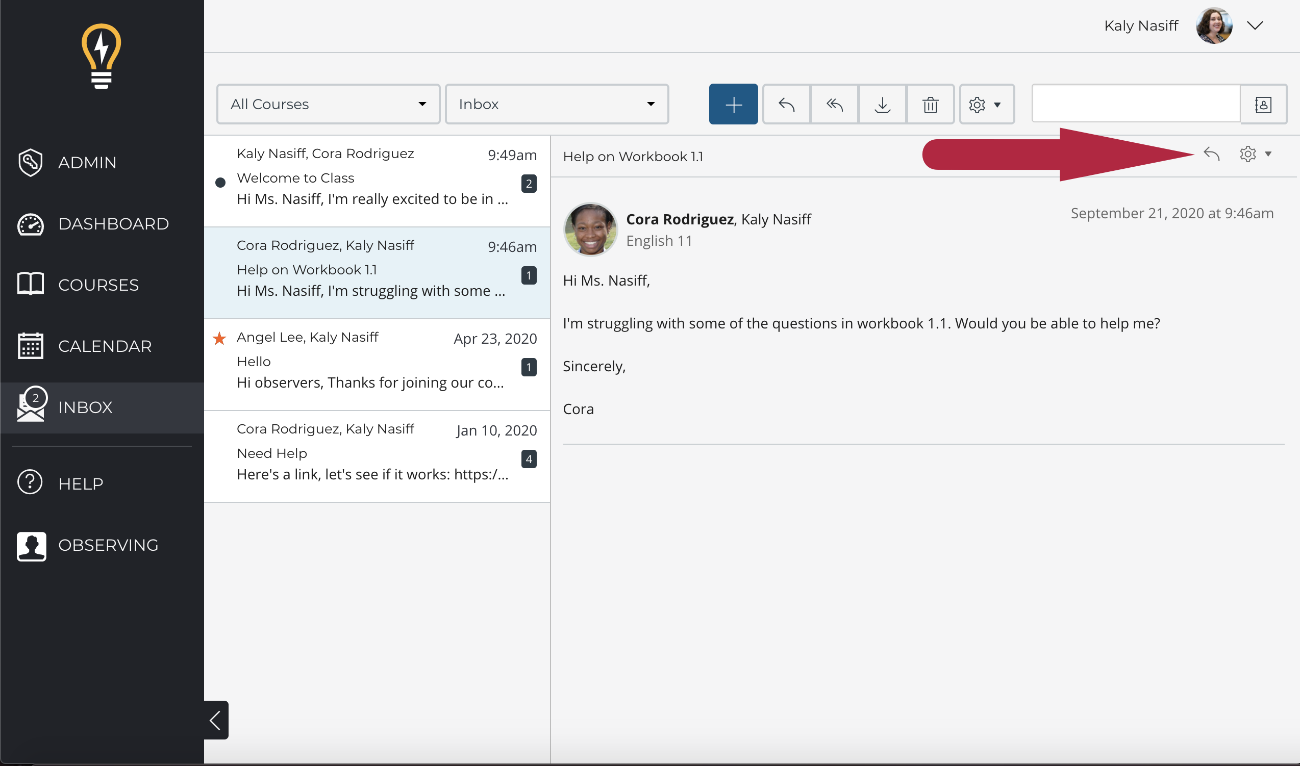 The inbox feature of your LMS allows users to send and receive messages within the LMS. Users can see messages across all their courses and can filter for messages pertaining to a specific course.